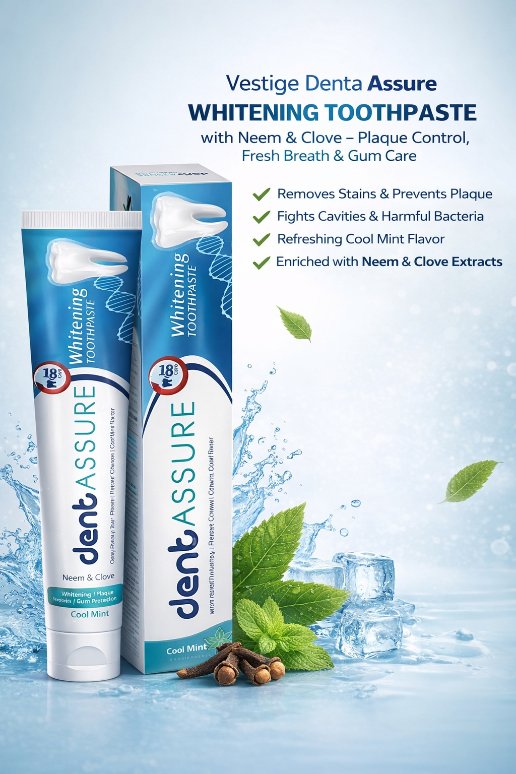 Vestige Denta Assure Whitening Toothpaste with Neem & Clove – Plaque Control, Fresh Breath & Gum Care (Cool Mint Flavor)